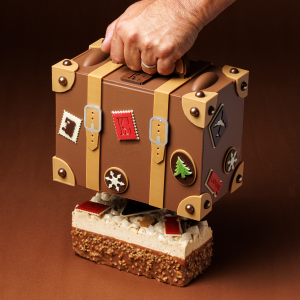 Après un entremets télécabine l'année dernière, voici la toute nouvelle création en édition limitée signée Sébastien Bouillet : l'entremets Globe Trotter, à l'allure de valisette. Cette incroyable valise au chocolat noir et lait de 800g abrite une crème légère à la vanille, sur un crémeux et biscuit aux noix de Pécan, streusel aux amandes.