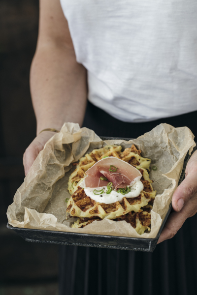 Ciseler finement l’oignon nouveau. Monter la crème à la rigotte de Condrieu en chantilly à l’aide d’un batteur. Déposer une cuillère généreuse de crème sur chaque gaufre, ajouter un peu de chiffonnade de jambon cru puis parsemer d’oignons nouveaux.
