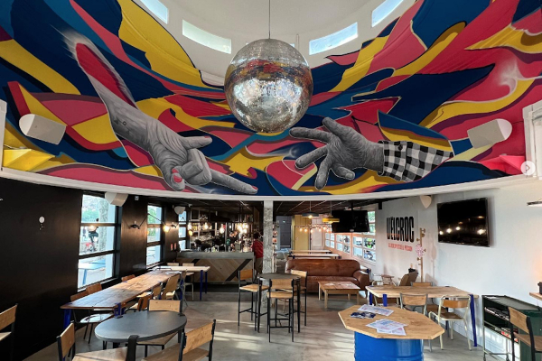 En plus d'être coffee shop le matin, avec un barista professionnel, cantine street-food le midi, bar dès 15h avec une sélection de bières craft et de vins natures, tapas dès 18h30, Pélo s'illustre aussi via un projet artistique. Celui d'inviter chaque année un artiste lyonnais à présenter, illustrer et dessiner son "pélo". Son œuvre sera exposée sur les murs du bar, sur les cartes ainsi que sur les t-shirts du staff - disponibles à la vente en édition limitée. Il aura également droit à sa carte food : la carte du Pélo. Une déclinaison de l'identité graphique de l'artiste dans l'assiette, à prix réduit. En cette rentrée 2023, c'est l'artiste Kesadi qui se prête au jeu. Rendez-vous fin octobre pour découvrir le résultat.