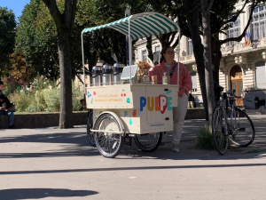On summer days, the multicoloured delivery tricycle ‘Quai des Glaces’ makes its way up and down the banks of the Rhône and crosses Place Bellecour, signalling its arrival with a little trumpet. For seven years now, it has revived Lyon’s tradition of mobile vendors, which were popular during the time of our grandparents’ generation. And it is not the only business on wheels criss-crossing the streets of Lyon. On the left bank of the Rhône, you can also find Camille Martinez of Pulpé, a tricycle selling juices, infusions and iced teas. “It was an obvious choice for me. I’ve always loved strolling in Lyon and when I was thinking about Pulpé and how it would work, I decided to model it on my own journeys in the city. I noticed that there was nowhere to buy drinks in some places. I thought to myself that I was probably not alone in experiencing this and that there would be potential customers at these spots,” told us the bubbly thirty-something, who you can find near Part-Dieu railway station and Sergent Blandan park. On the saddle of ‘Tritri’, as she nicknamed her delivery tricycle, Vic Remy Legrand, founder of Oupsi, decided to position herself on Quai Augagneur by the Rhône. In September 2022, she also started doing rounds. Her boxes of donuts and sweet treats, as well as lunch boxes, can now be picked up in Charpennes, Monplaisir and Blandan park. “I change routes according to the season and customer numbers. The easiest way to find me is to sign up to my newsletter or follow me on social networks,” said this chef specialised in plant-based food.