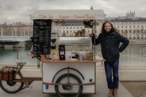 For these entrepreneurs, who brave the cold and heat, using their own muscle power to move equipment weighing as much as 200 kg, the main motivation in their day-to-day work comes from the relationships built with customers. According to Jonathan Estassy of The Vagabond Coffee, who sets up stall on Quai Augagneur on weekends: “People tend to stop around delivery tricycles. I like introducing people by their first names. I’ve even met up with some regular customers for drinks and meals out.” Vincent Jardé of Course Café has been driven by the same love of personal contact for the past five years. “Spreading a good mood and helping people take their minds of their worries are the cornerstones of a good mobile vendor,” said Vincent. Another thing they have in common is caring for the environment. “I thought about starting a food truck business, but I felt there was a conflict between offering environmentally responsible, zero-waste, locavore and vegan food, on the one hand, and driving a polluting vehicle, on the other,” Vic Remy Legrand told us. The same is true at Pulpé: “There is no sense in defending artisanship and small-scale producers while negatively impacting the environment. It’s also in keeping with the spirit of the times, as well as the dynamism of a big city like Lyon.” Having said that, they did not all choose pedal power for the same reasons. Camille of Pulpé realised that she could never spend her entire sitting in front of a computer, while Vic, of Oupsi, and Jonathan Estassy wanted to start a business with minimal financial risk. A sort of test run before setting up something more permanent.