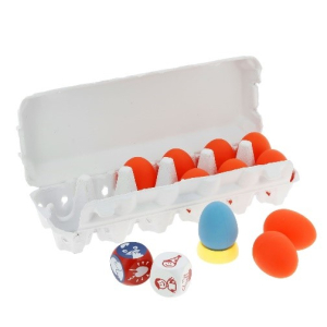 Le but de ce jeu : lancer un dé et réagir le plus rapidement possible pour pouvoir gagner l’œuf sur le coquetier. Une fois gagné, il faudra le coincer sous le menton, sous le bras, entre les genoux…et essayer de continuer jusqu’à avoir 5 œufs.